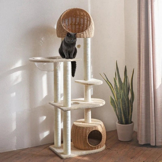 Que ce soit pour s’installer confortablement dans la capsule transparente, se cacher dans la niche en rotin ou faire ses griffes sur les poteaux en sisal, ce grand arbre à chat devient vite le terrain de jeu préféré de votre compagnon. Son design épuré et contemporain en bois clair et rotin chaud en fait aussi un véritable objet déco qui s’harmonise à votre intérieur. Durable et facile à entretenir, il est conçu pour durer et accompagner votre chat dans toutes ses aventures quotidiennes.