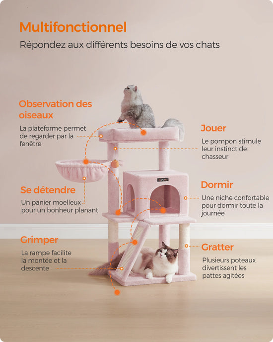 Offrez à votre compagnon à quatre pattes un véritable palace de douceur avec cet arbre à chat rose claire, aussi charmant qu’utile. Son design pastel s’intègre parfaitement dans un salon lumineux ou une chambre cocooning, tandis que ses plateformes rembourrées invitent à la détente et aux longues siestes paisibles. Entre les moments d’escalade, de jeu ou de griffe, chaque recoin devient un espace d’exploration et de plaisir félin. C’est plus qu’un simple accessoire : c’est un coin de paradis pour votre chat.